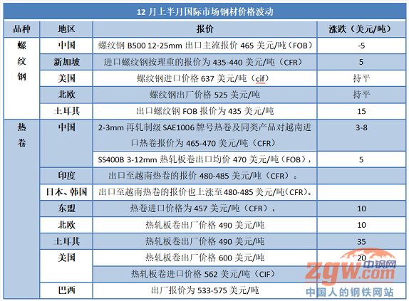 3. 國家煤礦安監(jiān)局展開集中整治,原料端仍有支撐國家煤礦安監(jiān)局近日發(fā)布通知,要求圍繞10個(gè)方面重點(diǎn)內(nèi)容,對全國開展為期3個(gè)月的煤礦安全集中整治。同時(shí),為督促推動(dòng)重點(diǎn)地區(qū)、重點(diǎn)企業(yè)煤礦安全集中整治工作,國家煤礦安監(jiān)局派出6個(gè)督導(dǎo)工作組,分別對山西省晉中市、朔州市,貴州省六盤水市、畢節(jié)市,云南省曲靖市,黑龍江省七臺(tái)河市,湖南省婁底市,陜西省渭南市等8個(gè)地區(qū)和龍煤集團(tuán)、陜煤化集團(tuán)、川煤集團(tuán)及芙蓉公司等3家企業(yè)進(jìn)行督導(dǎo)檢查。而此次督查也有助于進(jìn)一步淘汰退出落后產(chǎn)能,在產(chǎn)量上得以控制,價(jià)格會(huì)有所支撐。4. 12月全球鋼材市場進(jìn)入整理態(tài)勢鋼價(jià)經(jīng)過11月的大幅反彈之后,全球市場在12月進(jìn)入了整理階段。根據(jù)中鋼協(xié)數(shù)據(jù),全球鋼材價(jià)格指數(shù)周環(huán)比下跌0.2%,月環(huán)比上漲1.2%,月同比下跌10.6%,年同比下跌10.9%。從目前中國鋼材出口報(bào)價(jià)來看,并不具有價(jià)格優(yōu)勢。根據(jù)外貿(mào)數(shù)據(jù),11月我國出口鋼材458萬噸,較上個(gè)月的478萬噸下降4.2%,較上年同期的530萬噸則下滑13.6%。未來出口轉(zhuǎn)內(nèi)銷將進(jìn)一步增加供應(yīng)的壓力。