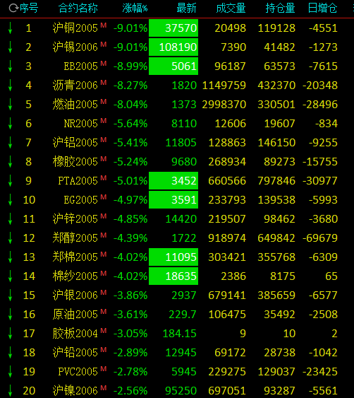 以銅為代表的有色金屬昨日午后暴跌,價格創下多年以來新低。今日國內期市收盤繼續是多數下挫的局面,有色金屬、化工期貨跌幅居前,滬銅、滬錫、苯乙烯、PTA、乙二醇、鄭棉、棉紗等7個品種跌停。瀝青、燃油跌逾8%,滬鋁、橡膠跌逾5%。貴金屬均下跌,滬金跌逾1%,滬銀跌近4%。