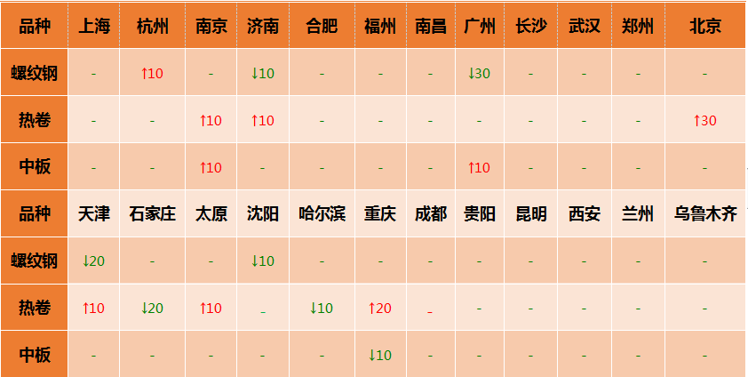 今日沒有期盤,現(xiàn)貨報(bào)價(jià)更多的體現(xiàn)了成交情緒。終端客戶按需采購,詢價(jià)不多,成交整體偏弱,商家暗降10-20出貨。各地區(qū)報(bào)價(jià)如下: