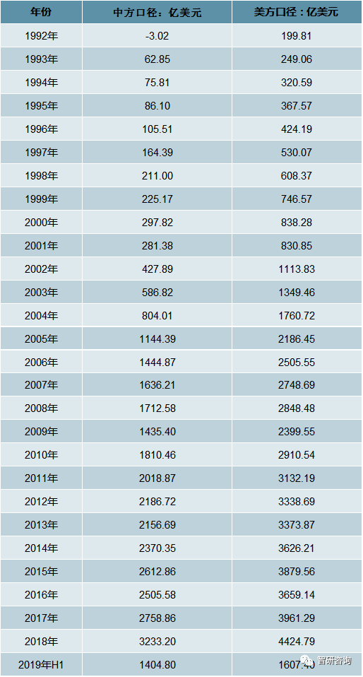 1992-2019年上半年中方口徑對(duì)美貿(mào)易情況
