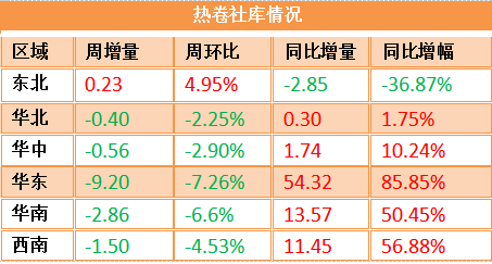 熱卷方面,華北地區庫存量接近去年同期,較去年高出1.75%,本周小幅降庫,周環比下降2.25%。華東、華南和西南地區較去年同期高出50%以上,降庫壓力仍在。
