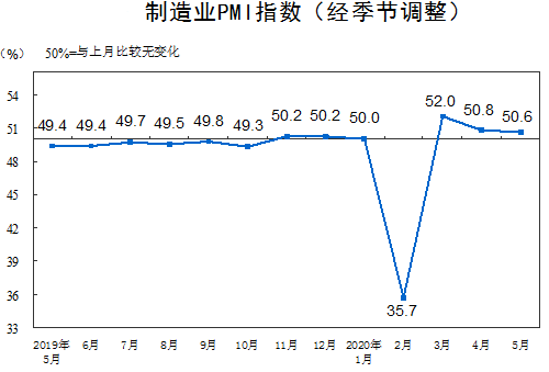 5月中國(guó)制造業(yè)采購(gòu)經(jīng)理指數(shù)PMI50.6%,比上月回落0.2個(gè)百分點(diǎn)。連續(xù)三個(gè)月處于榮枯線50%以上,反應(yīng)國(guó)內(nèi)制造業(yè)的持續(xù)恢復(fù),但隨著基數(shù)的擴(kuò)大,制造業(yè)恢復(fù)速度放緩。同時(shí),5月財(cái)新制造業(yè)PMI回升至50.7,疫情過(guò)后首次進(jìn)入擴(kuò)張區(qū)間。