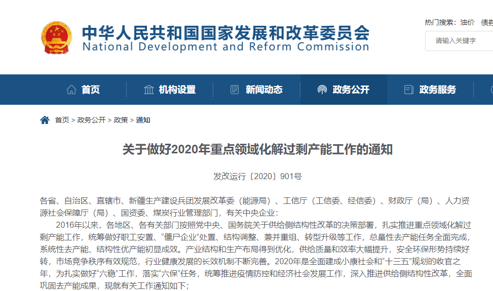 關于做好2020年重點領域化解過剩產能工作的通知 發改運行〔2020〕901號 各省、自治區、直轄市、新疆生產建設兵團發展改革委(能源局)、工信廳(工信委、經信委)、財政廳(局)、人力資源社會保障廳(局)、國資委、煤炭行業管理部門,有關中央企業: 2016年以來,各地區、各有關部門按照黨中央、國務院關于供給側結構性改革的決策部署,扎實推進重點領域化解過剩產能工作,統籌做好職工安置、“僵尸企業”處置、結構調整、兼并重組、轉型升級等工作,總量性去產能任務全面完成,系統性去產能、結構性優產能初顯成效。產業結構和生產布局得到優化,供給質量和效率大幅提升,安全環保形勢持續好轉,市場競爭秩序有效規范,行業健康發展的長效機制不斷完善。2020年是全面建成小康社會和“十三五”規劃的收官之年,為扎實做好“六穩”工作,落實“六保”任務,統籌推進疫情防控和經濟社會發展工作,深入推進供給側結構性改革,全面鞏固去產能成果,現就有關工作通知如下; 一、準確把握2020年去產能總體要求。以習近平新時代中國特色社會主義思想為指導,全面貫徹黨的十九大和十九屆二中、三中、四中全會精神,按照中央經濟工作會議要求,緊扣全面建成小康社會目標任務,堅持穩中求進工作總基調,堅持新發展理念,堅持以供給側結構性改革為主線,堅持以改革開放為動力,推動高質量發展。堅持鞏固、增強、提升、暢通的方針,著力鞏固去產能成果,持續推動系統性去產能、結構性優產能,不斷提升職工安置和資產債務處置質量,全面提高行業治理能力。 二、全面鞏固去產能成果。尚未完成“十三五”去產能目標的地區和中央企業,要統籌推進各項工作,確保去產能任務在2020年底前全面完成。全面實施去產能項目“回頭看”,認真落實產能認定、關閉標準、獎補資金使用、產能置換等方面的相關規定,確保各類督查和自查發現的問題及時整改到位。國家有關部門將繼續開展鞏固鋼鐵煤炭去產能成果專項督查抽查,堅決防止已經退出的項目死灰復燃。進一步完善去產能和產能置換工作臺賬,為“十四五”發展打好基礎。切實抓好去產能政策的宣貫落實,強化監督問責,確保相關要求落實落細落地。 三、繼續深化鋼鐵行業供給側結構性改革。進一步完善鋼鐵產能置換辦法,加強鋼鐵產能項目備案指導,促進鋼鐵項目落地的科學性和合理性。進一步加強事中事后監管,嚴格落實安全、環保、能耗、質量、用地、產業政策和產能置換等相關要求,嚴禁以任何名義、任何方式新增鋼鐵冶煉產能,嚴肅查處各類鋼鐵產能違法違規行為,加快推動落后產能退出,嚴防“地條鋼”死灰復燃和已化解過剩產能復產。指導企業復工復產,做好行業運行監測分析,維護行業平穩運行。進一步推動鋼鐵行業綠色化發展,加快京津冀及周邊地區、長三角地區、汾渭平原等大氣污染防治重點區域鋼鐵企業超低排放改造,發展電爐鋼工藝。進一步推動鋼鐵企業實施兼并重組,增強企業創新意識,為鋼鐵行業實現由大到強轉變奠定堅實基礎。 四、持續推進煤炭上大壓小、增優汰劣。嚴格安全、環保、質量等方面執法,堅決淘汰不具備安全環保條件、不符合產業政策的落后產能。堅持產能置換長效機制,引導低效無效產能有序退出。深入推進煤炭行業“放管服”改革,加快推動在建煤礦投產達產,合理有序釋放先進產能,實現煤炭新舊產能有序接替。統籌推進煤電聯營、兼并重組、轉型升級等工作,促進煤炭及下游產業健康和諧發展。著力加強煤炭產供儲銷體系建設,持續提升供給體系質量,增強能源保障和應急調控能力。充分發揮市場配置資源的決定性作用,不斷完善現代煤炭交易市場體系,進一步降低交易成本、提高市場效率。 五、積極穩妥推進煤電優化升級。充分發揮市場調節和宏觀調控作用,淘汰關停不達標落后煤電機組。繼續做好現有違規建設煤電項目的清理整頓工作,堅決杜絕新發生違規建設煤電項目的情況。發布實施年度風險預警,按需有序核準建設煤電項目,按需適度新增煤電產能,做好煤電應急備用和應急調峰儲備電源工作。持續推進燃煤電廠超低排放和節能改造工作。進一步增強電力、熱力供應保障能力,鞏固化解煤電過剩產能工作成果,提升煤電清潔高效發展水平。 六、加快“僵尸企業”處置。認真貫徹落實黨中央、國務院關于“僵尸企業”處置的決策部署,依法依規加快處置2019年底摸底確定并上報國務院辦公廳的“僵尸企業”。各地區和中央企業要按照要求建立健全工作機制,履行主體責任,加強督促檢查,原則上在2020年底前完成已摸底確定并上報的鋼鐵、煤炭行業“僵尸企業”處置工作。 七、嚴格控制產能總量。更多運用市場化、法治化手段,在控制產能總量的前提下,調整優化存量。嚴格落實《關于完善鋼鐵產能置換和項目備案工作的通知》要求,暫停鋼鐵產能置換和項目備案,并開展自查自糾工作,確保鋼鐵項目要符合安全、環保、能耗、質量、用地、產業政策和產能置換等相關要求。嚴格禁止在國家公園、自然保護區、風景名勝區、飲用水水源保護區規劃布局新的煤礦項目,嚴格限制高硫高灰高砷煤項目開發。 八、統籌做好去產能保供應穩預期工作。有關地區和中央企業要充分認識供需形勢的新變化新特點,堅持實事求是、因地制宜,綜合考慮地