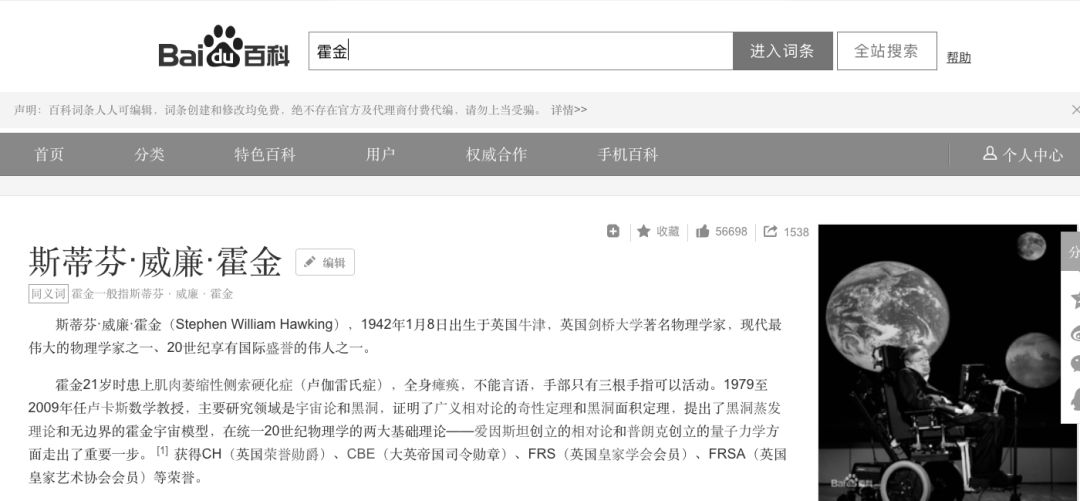 百度百科中,霍金的詞條已變為黑色。
