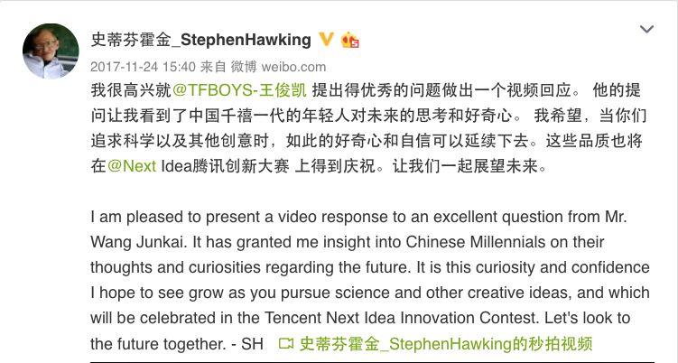 2017年11月5日,在北京展覽館劇場,霍金在2017騰訊WE大會中進行了視頻演講。在這場演講中,霍金似乎給我們指出了一個未來: