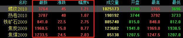 期螺漲45收報3764,期卷漲40收報3787,鐵礦石漲22.5收報841,焦炭漲15收報1960.5,焦煤漲24.5收報1233.5。