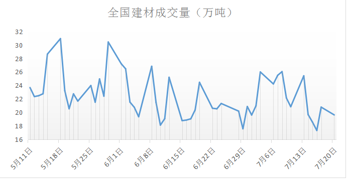 日內期貨反彈,對現貨報價帶來提振,但市場成交整體偏謹慎,主要集中在低價資源。從最近全國建材成交量來看,近一周均在20萬噸左右徘徊,雨季對下游開工的影響依然存在。
