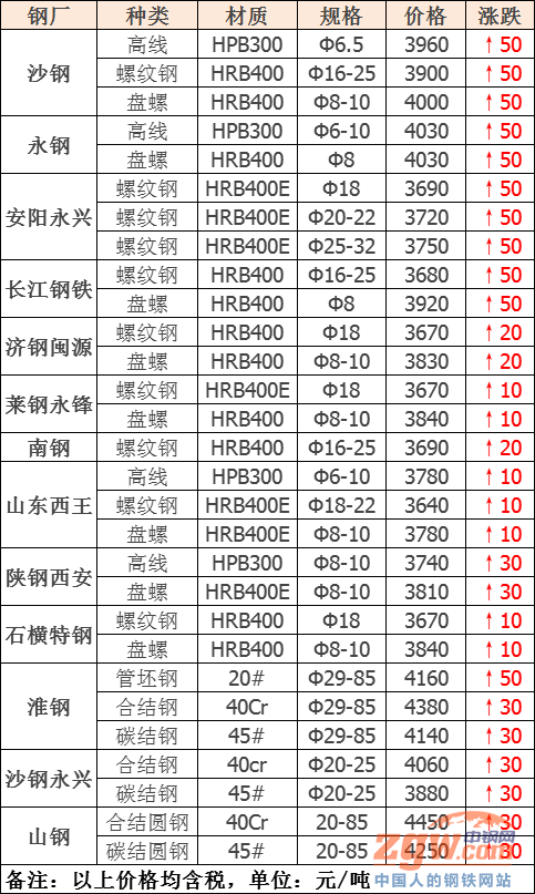 3、螺紋上漲50元/噸:HRB400Ф16-25mm螺紋出廠價格為3900元/噸,Φ10mm加價160元/噸,Φ12mm加價100元/噸,Φ14mm加價30元/噸,Φ28-32mm規格加價60元/噸,Φ36、Φ40mm規格加價250元/噸,抗震鋼筋加價30元/噸。