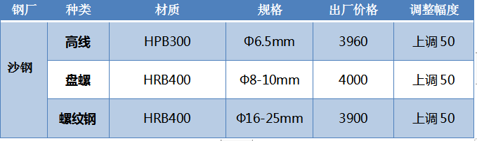 沙鋼在7月下旬價格基礎上,出臺2020年8月上旬建材價格政策:1、高線:價格上漲50元,現6.5mmHPB300普碳高線出廠價格為6元/噸。2、盤螺:價格上漲50元,現Ф8-10mmHRB400盤螺出廠價格4000元/噸。3、螺紋:價格上漲50元,現HRB400Ф16-25mm螺紋出廠價格為3900元/噸。4、HRB500和HRB500E在同規格HRB400基礎上加價300元/噸和330元/噸。5、完成計劃量,對上期螺紋補120元/噸,盤螺無補差。以上價格均為含稅,自2020年8月1日起執行。