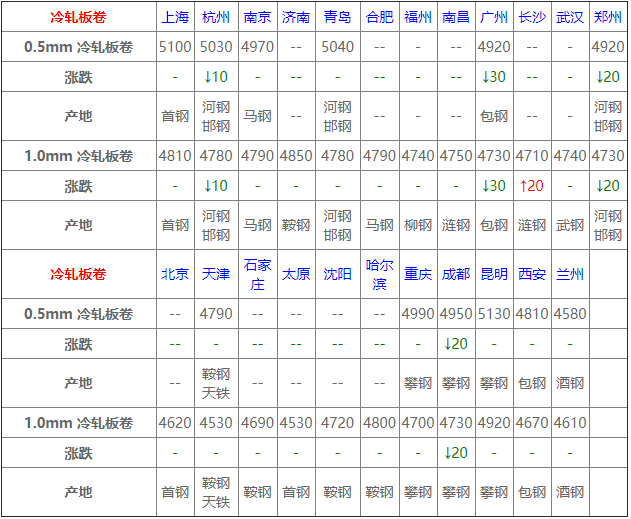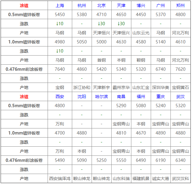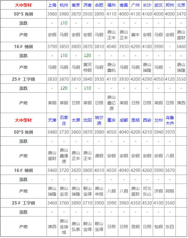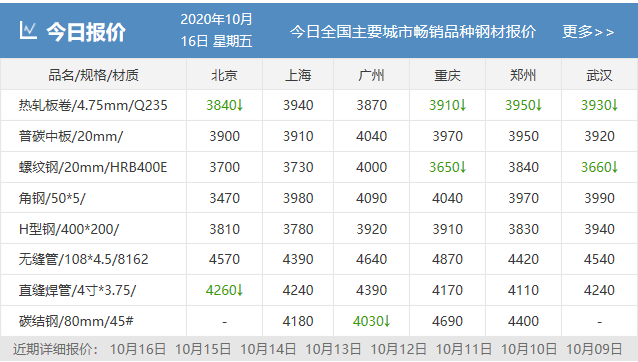 據數據監測,今日共22家鋼廠調價,其中漲幅最高為福建三鋼建材,調價幅度50元/噸,跌幅最大為元寶山板材,調價幅度30元/噸,具體調價明細如下: 鋼廠調價 唐城工字鋼價格平穩 萊鋼永鋒建材價格平穩 石橫特鋼建材價格平穩 江蘇雨花建材價格平穩 河鋼天津建材價格平穩 河鋼北京建材價格平穩 山西美錦建材價格平穩 鑫億源H型鋼價格平穩 韶鋼建材上調20元/噸 福建三鋼建材上調50元/噸 瑞豐帶鋼價格上調10元/噸 冀鋼中厚板下調20元/噸 元寶山板材下調30元/噸 普陽中厚板下調10元/噸 東方鋼廠槽鋼下調20元/噸 山東傳洋型材下調10元/噸 大成工字鋼下調10元/噸 弘泰工字鋼下調10元/噸 電力型材下調10元/噸 鑫杭槽鋼下調10元/噸 友發鍍鋅管價格下調30元/噸 江蘇鴻泰螺紋鋼下調30元/噸 鋼廠調價占比 上調3家,占比13.6%,調價幅度10-50元/噸。 下調11家,占比50%,調價幅度10-30元/噸。 平穩8家,占比36.4%。 重要產業信息 一、預期2020年全球鋼鐵需求將下降2.4% 世界鋼鐵協會:預期2020年全球鋼鐵需求將下降2.4%至17.25億噸(此前預期為下降6.4%),預期2021年全球鋼鐵需求將增長4.1%至17.95億噸,預期2021年中國鋼鐵需求將保持平穩,發達經濟體的鋼鐵需求將增長7.9%。 二、山西發布秋冬季實施錯峰生產計劃 《通知》明確,此次錯峰生產范圍包括鋼鐵、有色、焦化、化工、建材(磚瓦、耐火、陶瓷、石灰、水泥熟料及粉磨站)、鑄造等重點涉氣行業企業(或工序)。 三、黔西南州煤礦9月淘汰落后產能情況 截至9月底,普安縣桂興煤礦和小岔溝煤礦通過省州縣級相關部門關閉驗收,退出產能69萬噸/年;貴州省煤炭工業淘汰落后產能加快轉型升級領導小組辦公室公告興義市超強煤礦和興仁市菜子田煤礦關閉,公告關閉產能90萬噸/年。 四、越南9月鋼材進口為101萬噸 越南海關公布的數據顯示,9月份,越南鋼材進口為101萬噸,較8月下滑15.3%,廢鋼進口環比下降28.9%,至485,625噸。1-9月,越南鋼材進口累計為1,036萬噸,較去年同期下降4%,廢鋼進口同比增加1.1%,至429萬噸。 五、10月上旬11家重點企業汽車銷量同比下降24% 中汽協數據顯示,2020年10月上旬,11家重點企業汽車產銷分別完成45.6萬輛和34.4萬輛,同比分別下降3.8%和