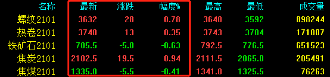 期螺上漲28收報3632,期卷上漲13收報3740,鐵礦石跌5收報785,焦炭漲19.5收報2102.5,焦煤跌5.5收報1335。