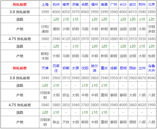 熱卷24個市場中14個市場下跌10-20,4.75熱軋板卷平均價格3913元/噸,較上個交易日下調8元/噸。
