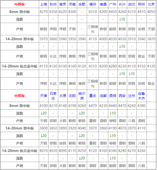 中板24個市場中5個市場下跌10-20,14-20mm普中板平均價格3970元/噸,較上個交易日下調3元/噸。
