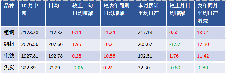 1、中鋼協:10月中旬重點鋼企粗鋼日均產量217.33萬噸,環比增加0.3萬噸或0.14%