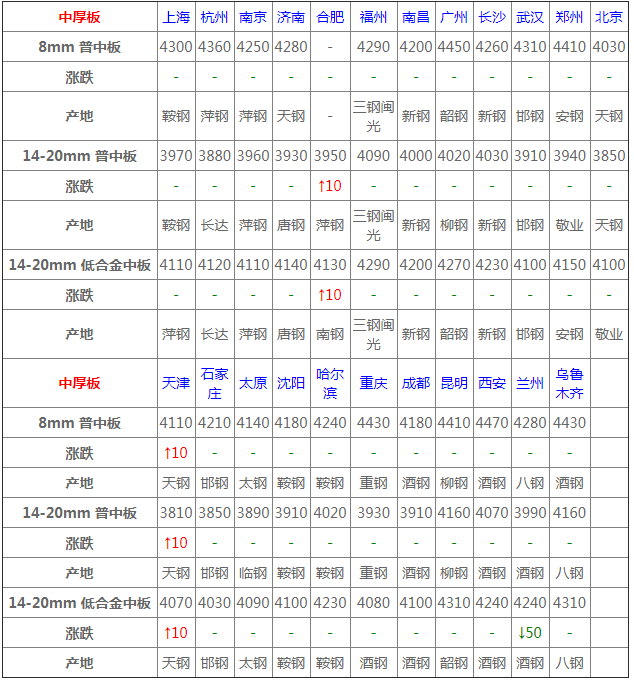 中板24個市場中2個市場上漲10,14-20mm普中板平均價格3967元/噸,較上個交易日上調1元/噸。