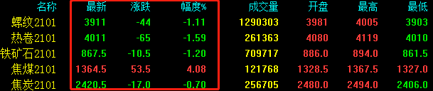 今日期鋼大跌,期螺跌44收報3911,期卷跌65收報4011,鐵礦石跌10.5收報867.5,焦煤漲53.5收報1364.5,焦炭跌17收報2420.5。