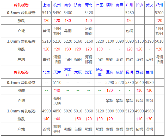 今冷軋市場主流偏強,市場心態謹慎樂觀,今早盤價格繼續上調,據代理商反饋,除期貨上沖及關聯熱軋市場走強提振外,鋼廠挺價的意愿也十分明顯,對商家心態有較強支撐,預計短期冷軋板卷價格仍有小幅向上空間