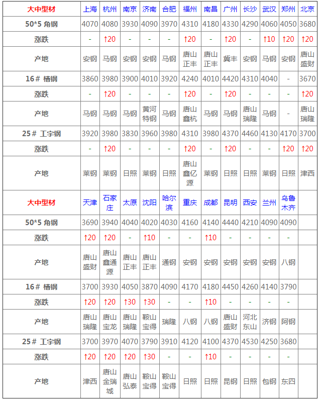 今型材主流拉漲。市場成交情況依舊較好,部分品種供應偏緊的局面難有改善,價格方面走勢呈持穩態勢。然由于市場部分資源依舊緊俏,商家低價銷售意愿不高,加上鋼坯接連走強提振,鋼企報價跟漲積極,中間商亦高位堅挺出貨為主。預計短期型材市場將高位調整運行。