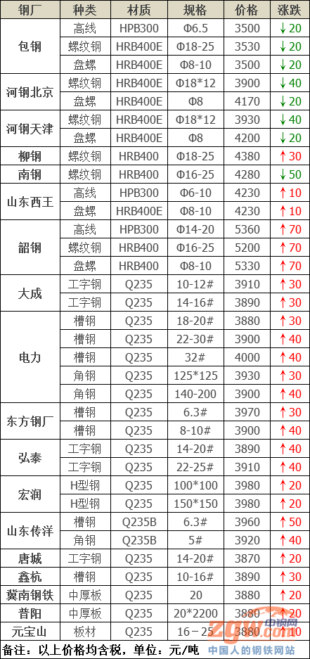 據數據監測,今日共20家鋼廠調價,其中漲幅最高為韶鋼建材,調價幅度70元/噸,跌幅最大為南鋼螺紋,調價幅度50元/噸,具體調價明細如下: