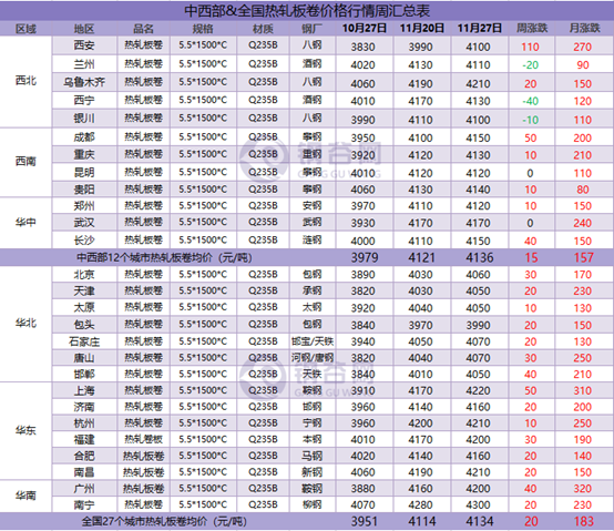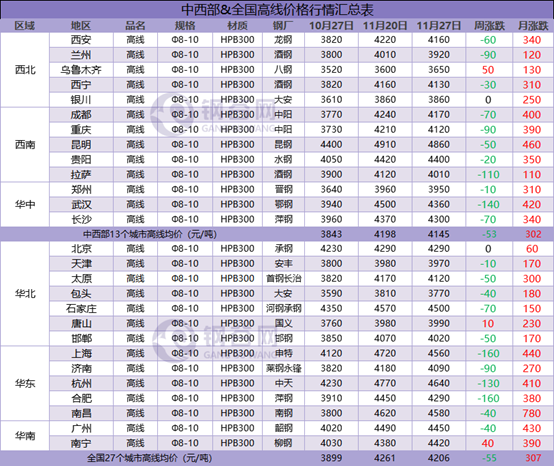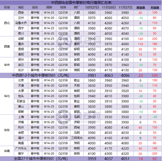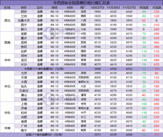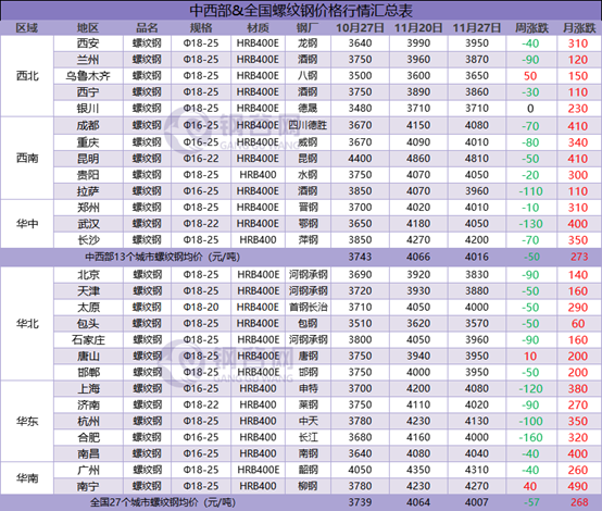 據(jù)鋼谷網(wǎng)數(shù)據(jù)監(jiān)測,本周全國主要城市鋼材市場價格盤整運行,調整空間10-160元/噸,板材強于長材。截止11月27日,全國27個城市螺紋鋼均價4007元/噸,較上周跌57元/噸;全國27個城市高線均價4206元/噸,較上期跌55元/噸;全國27個城市盤螺均價4284元/噸,較上期跌55元/噸;全國27個城市熱軋板卷均價4134元/噸,較上周漲20元/噸;全國27個城市中厚板均價4051元/噸,較上期漲14元/噸。