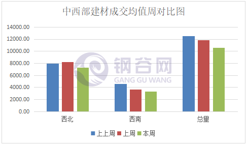 本周中西部建材成交量較上周日均成交量減少1239.55噸,降幅10.47%。