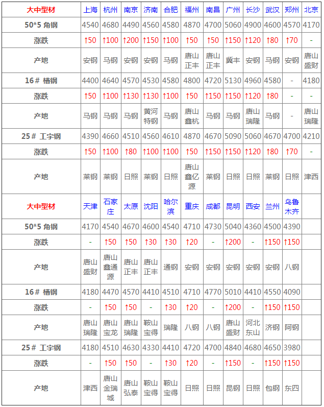 鋼坯再度拉漲20,成本端支撐繼續(xù)偏強(qiáng),但坯料拉漲幅度放緩,隨著期螺下調(diào),現(xiàn)貨市場操盤情緒不佳,經(jīng)銷商手中現(xiàn)貨較少,市場造成一定的恐慌,進(jìn)貨成本上漲,商家積極跟漲,雖成本一直高位運(yùn)行,型價(jià)將理性回溫,預(yù)計(jì)明日型材價(jià)格或持穩(wěn)運(yùn)行。