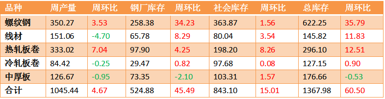 本周五大品種產量小幅回升,庫存由降轉增,且廠庫增幅明顯大于社庫,說明鋼廠庫存向社會庫存轉移放緩。且表觀需求較上周下降102萬噸,螺紋鋼表觀需求下降58萬噸。年關將至,淡季需求回落壓力將進一步凸顯,庫存有繼續累增的風險。