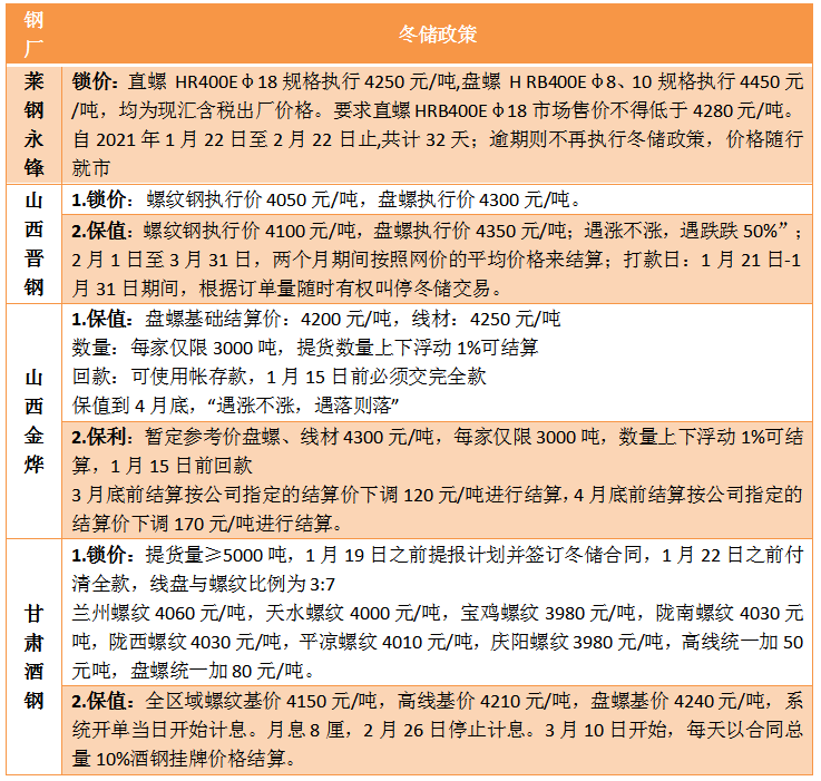 部分鋼廠相繼出臺冬儲政策,螺紋鋼最低鎖價在4000左右,低于市場均價200-300元/噸。由于當前價格仍處于歷史相對高位,貿易商冬儲謹慎,而鋼廠目前庫存壓力并不突出,部分已有自儲的準備。
