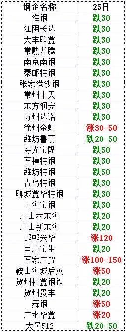 25日唐山廢鋼價格:重A3170-3130,一級破碎2960-3000,花鐵壓塊3160-3190,鋼銷團銷塊2640-2800,彩鋼瓦小壓塊2500-2540,鋼坯頭3170-3210,矽鋼片2940-2990,鋼筋切頭3250-3305,不含稅。