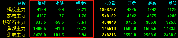 期鋼跌破4200,期螺大跌94收報4154,期卷下跌77收報4307,鐵礦石下跌55.5收報933.5,焦煤下跌41收報1465.5,焦炭下跌101.5收報2476。