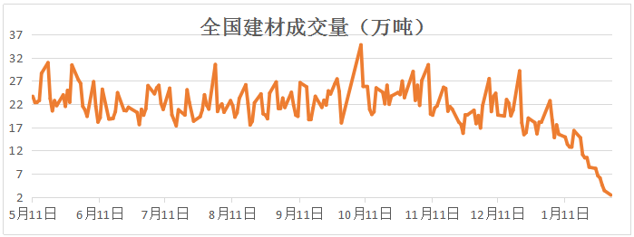 全國建材成交持續回落,本周第一個交易日成交量回落至3萬噸以下,隨著商家逐步離場,市場成交進一步接近冰點,鋼價逐步進入有價無市的階段。