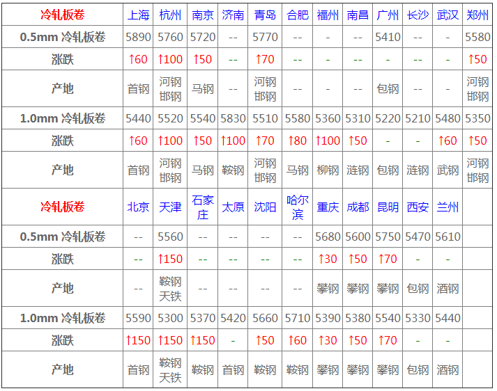 今日冷軋市場拉漲運行。1.0mm寶鋼 冷卷報5950元/噸,1.0mm馬鋼冷卷報5550元/噸,1.5mm本鋼冷卷報5390-5400元/噸,1.5mm本鋼冷板報5400-5420元/噸,1.0-2.0mm鞍鋼冷板報5550-5630元/噸.
