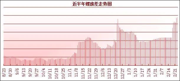 鋼價幾天大幅拉漲,交投并未有明顯增量,對此,我們期待元宵節后的數據。廢鋼面臨的情況相似又相反,同樣漲價超過200元,賣家沒貨或者有貨也不賣的現象不少,我們從螺廢差(螺紋鋼-廢鋼)的走勢來看下:
