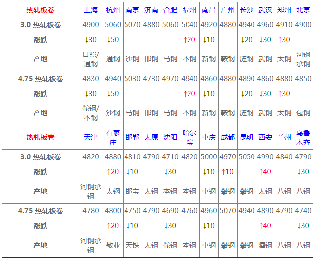 今熱卷弱勢運行,沈陽4700跌20,鞍山4750跌20,長春4750跌20,哈爾濱4840穩(wěn);華南熱卷偏弱調整,樂從4860-4870跌10,廣州4860-4870跌10,柳州4890跌10,南寧4890跌10;華北熱卷價高位松動,開平板基價4780,3.5-11.75安豐/燕鋼/縱橫熱卷資源報價4730-4770,邯鄲4770,天津4770-4820,中鐵直發(fā)4750-4760,博興現貨4770-4800。今早開盤弱穩(wěn)觀望,盤中期貨走勢不佳,現貨采買謹慎觀望,商家松動10-20。今價弱穩(wěn)運行。期卷主力震蕩向弱,現貨商家多持幣觀望,整體交投顯冷清,市場高位資源低靠。料短期小幅偏弱調整。