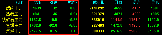 期鋼早盤震蕩隨即下跌,收盤期螺下跌32報4639,期卷下跌46收報4841,鐵礦石下跌9.5收報1132.5,焦煤下跌82收報1402,焦炭下跌81.5收報2477.5。
