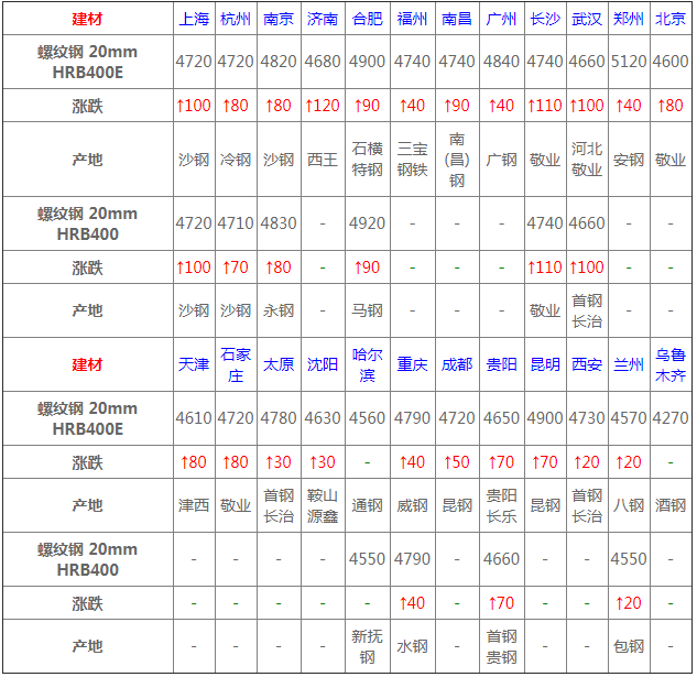 今日建材價格漲幅較大,在利好消息的刺激下,期貨市場大幅上漲,現貨市場也是蓄勢待發。但經過昨天的爆發后,需求顯得比較疲軟,高價資源成交乏力,因此近期市場沖高難度會加大,但也有很強的成本支撐,因此價格近期將繼續高位震蕩。