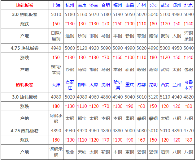 今全國熱軋市場寬幅上行,幅度30-140元,期卷高開高走,現貨堅挺運行,然高位成交受阻,主動地區領先回落,整體成交一般;預計熱軋板卷價格繼續上漲;