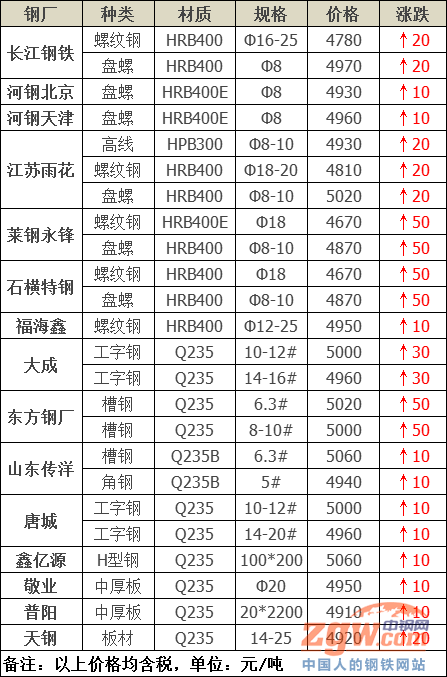 據數據監測,今日共23家鋼廠調價,其中漲幅最高為萊鋼永鋒建材,調價幅度50元/噸,具體調價明細如下: