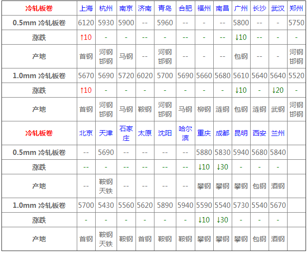 今全國冷軋市場漲跌穩均現,幅度20-40,期貨震蕩運行,商家心態一般,挺價出貨為主,部分地區低價走貨,現貨市場整體成交一般;