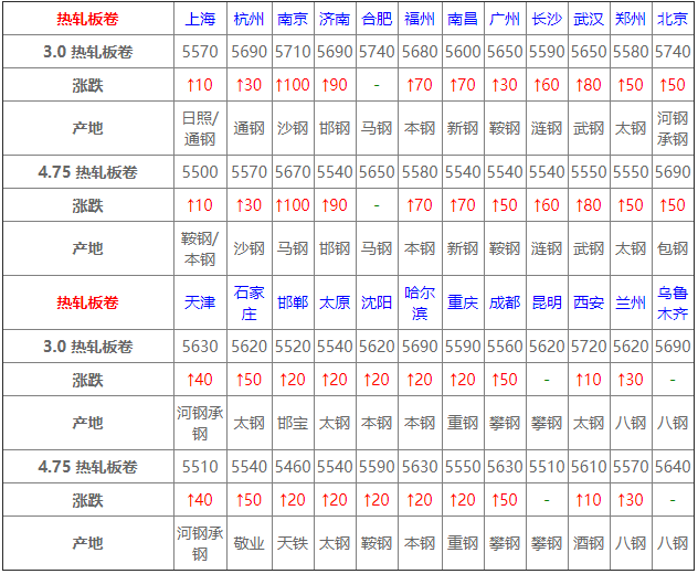 今全國熱扎市場堅挺運行,幅度20-100元,期卷高位運行,鋼坯累漲支撐,現貨市場心態偏好上行調整為主,終端需求尚可,但交投較昨日偏弱;