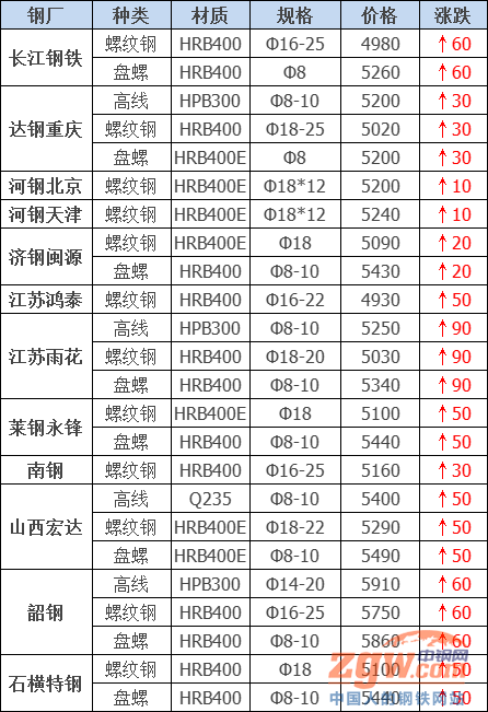 據數據監測,今日共30家鋼廠調價,其中漲幅最高為江蘇雨花建材,調價幅度90元/噸,具體調價明細如下: