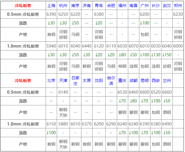 今全國冷軋穩中偏弱,幅度20-100,受熱卷期貨和原料弱行影響,冷軋現貨市場情緒低迷,商家心態偏弱,多以走貨為主,然終端采補較為謹慎,以觀望為主,市場實際交投氛圍偏弱;