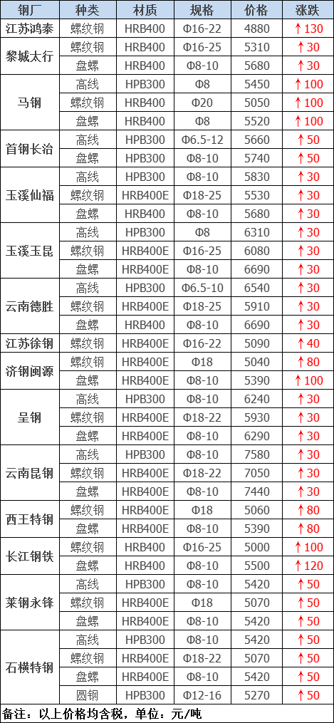 據(jù)數(shù)據(jù)監(jiān)測,今日共15家鋼廠調(diào)價,其中漲幅最高為江蘇鴻泰螺紋鋼,調(diào)價幅度130元/噸,具體調(diào)價明細如下: 鋼廠調(diào)價 呈鋼建材價格上調(diào)30元/噸 馬鋼建材價格上調(diào)100元/噸 黎城太行建材價格上調(diào)30元/噸 首鋼長治建材價格上調(diào)50元/噸 江蘇徐鋼建材價格上調(diào)40元/噸 玉溪玉昆建材價格上調(diào)30元/噸 玉溪仙福建材價格上調(diào)30元/噸 德勝昆明建材價格上調(diào)30元/噸 云南昆鋼建材價格上調(diào)30元/噸 西王特鋼建材價格上調(diào)80元/噸 萊鋼永鋒建材價格上調(diào)50元/噸 石橫特鋼建材價格上調(diào)50元/噸 江蘇鴻泰建材價格上調(diào)130元/噸 山東閩源建材價格上調(diào)80-100元/噸 長江鋼鐵建材價格上調(diào)100-120元/噸 鋼廠調(diào)價占比 上調(diào)15家,占比100%,調(diào)價幅度30-130元/噸。