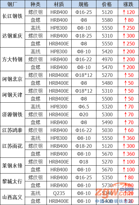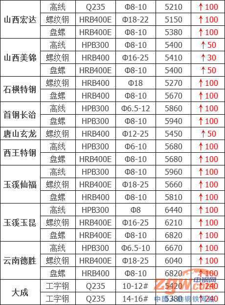 據不完全統計,今日共32家鋼廠調價,漲幅最高為江蘇雨花高線,調價幅度360元/噸,具體調價明細如下: 黎城太行建材上調80元/噸 河鋼北京建材上調50元/噸 河鋼天津建材上調50元/噸 山西高義建材上調20元/噸 電力型材上調150-250元/噸 首鋼長治建材上調100元/噸 山西宏達建材上調100元/噸 唐山玄龍螺紋鋼上調50元/噸 山西美錦建材上調30-50元/噸 大成工字鋼上調240元/噸 唐城工字鋼上調210元/噸 宏潤H型鋼上調200元/噸 弘泰工字鋼上調200元/噸 鑫億源H型鋼上調190元/噸 天鋼板材上調200元/噸 普陽中厚板上調150元/噸 敬業中厚板上調150元/噸 方大特鋼建材上調200元/噸 西王特鋼建材上調100元/噸 江蘇鴻泰螺紋鋼上調60元/噸 長江鋼鐵建材上調80-120元/噸 江蘇雨花建材上調300-360元/噸 萊鋼永鋒建材價格上調100元/噸 石橫特鋼建材價格上調100元/噸 山東傳洋型材上調180-230元/噸 常州東方優鋼上調60元/噸 廣富優鋼上調70-140元/噸 濟源鋼鐵建材上調70元/噸 玉溪仙福建材上調100元/噸 玉溪玉昆建材上調100元/噸 云南德勝建材上調100元/噸 達鋼重慶建材上調250-300元/噸 上調32家,占比100%,調價幅度20-360元/噸; 平穩15家,占比50%。 今日鋼廠價格強勢運行。期螺持紅上揚,低價資源成交有所放量,但隨著價格的走高,高價資源出貨有所放緩。本次漲價主要為恢復性上漲,鋼廠普遍認為隨著前期價格一路暴跌,已經逐漸探底,今日回漲主因是價格已降至市場心理預期,且下游剛需逐步釋放,市場報價有進一步提漲的可能。綜合來看,預計短期鋼廠價格震蕩趨強。