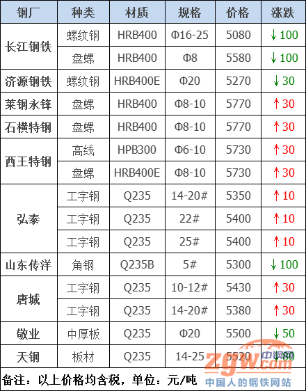 據數據監測,今日共19家鋼廠調價,其中漲幅最高為萊鋼永鋒建材,調價幅度30元/噸,跌幅最大為長江鋼鐵建材,調價幅度100元/噸,具體調價明細如下: 鋼廠調價 河鋼北京建材價格平穩 河鋼天津建材價格平穩 武安裕華高線價格平穩 福海鑫螺紋鋼價格平穩 唐山玄龍螺紋鋼價格平穩 石橫特鋼建材上調30元/噸 萊鋼永鋒建材上調30元/噸 西王特鋼建材上調30元/噸 濟源鋼鐵建材下調30元/噸 長江鋼鐵建材下調100元/噸 電力型材價格平穩 大成工字鋼價格平穩 宏潤H型鋼價格平穩 鑫億源H型鋼價格平穩 弘泰工字鋼上調10元/噸 唐城工字鋼上調30元/噸 山東傳洋型材下調100元/噸 敬業中厚板下調50元/噸 天鋼板材下調80元/噸 鋼廠調價占比 上調5家,占比26.3%,調價幅度10-30元/噸。 下調5家,占比26.3%,調價幅度30-100元/噸。 平穩9家,占比47.4%。 價格簡評 今日鋼廠價格震蕩運行,黑色系期貨持綠下跌,鋼廠心態多謹慎觀望,整體報價弱勢,山東個別鋼廠略有上調。另外據市場反饋情況來看,下游和貿易商采購的積極性不強,每日成交量有限,市場交投氛圍冷清,后市預期并不被看好,加之正值鋼市淡季,終端需求持續跟進不足。綜上所述,預計短期國內鋼廠價格將弱穩運行。