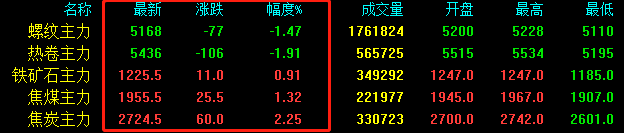 今日期鋼早盤跌幅較大,午后跌勢略有放緩,但整體依舊偏弱:期螺下跌77收報5168,期卷下跌106收報5436,原料走勢相對堅挺。鐵礦石上漲11收報1225.5,焦煤上漲25.5收報1955.5,焦炭上漲60收報2724.5。