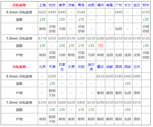今全國冷軋穩中下調,幅度10-50,相關期貨走弱,影響現貨市場,商家多以出貨為主,然終端節假日后多觀望為主,采補態度較為謹慎,市場實際交投氛圍一般,成交較差;