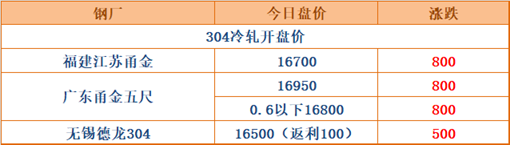 早市無錫市場,304報價漲幅達100-200元/噸,鋼廠開盤大漲之后,市場貿易商也是立即補漲100元/噸,再加上由于青山系304冷軋期貨雖然價格有優勢,但只針對下游客戶,市場惜售情緒漸濃。