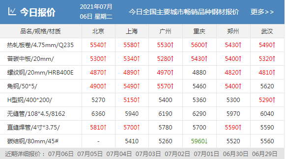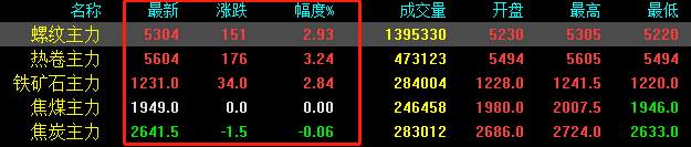 期鋼今日持續拉漲,期螺上漲151收報5304,期卷上漲176收報5604,鐵礦石上漲34收報1231,焦煤持穩,焦炭下跌1.5收報2641.5。