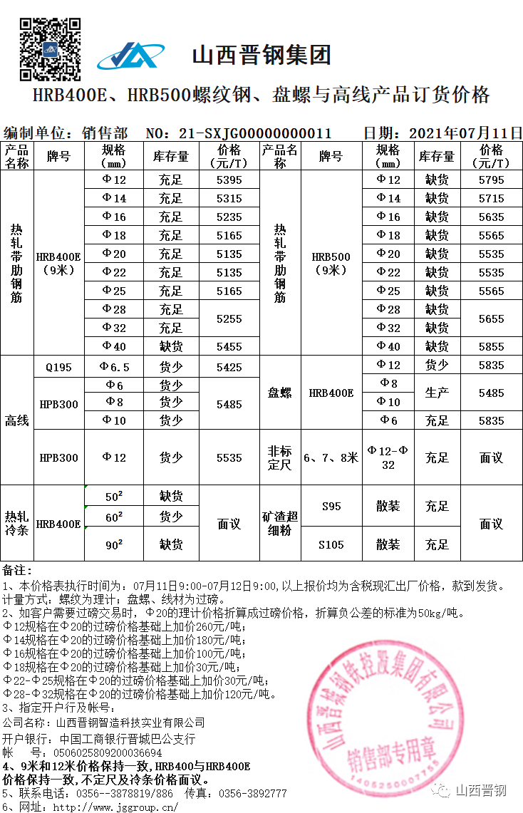【合肥馬鋼】11日馬鋼建材漲40元。合肥倉庫提貨抗震螺紋5310元/噸,線材5660元/噸,盤螺5690元/噸;馬鞍山倉庫提貨抗震價格:螺紋5300元/噸,線材5650元/噸,盤螺5680元/噸。 【安陽沙鋼】11日調(diào)整信息:2021年7月第2期HRB400E螺紋鋼以∮18為基礎價格,在7月1期價格基礎上上調(diào)130元/噸。12mm加220元/噸,14mm加160元/噸,16mm加80元/噸,20-22mm加價30元/噸,25mm加60元/噸,28-32mm加100元/噸,36-40mm加200元/噸。 【首鋼長鋼】11日首鋼長鋼價格調(diào)整信息:從9時起,對螺紋鋼、理計光圓鋼筋、盤螺、線材、普圓、碳圓、錨桿鋼、型鋼價格統(tǒng)一上調(diào)50元/噸,結(jié)算以電商系統(tǒng)中實提時間為準。 【山西建邦】11日山西建邦建材出廠價螺紋、盤螺、線材漲50:螺紋5100元/噸,盤螺5400元/噸,線材5400/噸。 【河南濟鋼】11日河南濟鋼集團對建材產(chǎn)品價格調(diào)整如下:1、棒材螺紋價格上調(diào)80元/噸;2、建筑用盤圓、盤螺價格上調(diào)80元/噸。 【連云港亞新】7月11日起,連云港亞新廢鋼漲30元。一、鋼板料,模具鋼,價3580;二、12毫米厚優(yōu)質(zhì)重廢A,價3550;三、6毫米厚重廢B,價3460,四、4毫米厚中廢新料,價3330-3380。(單位:元/噸) 【郎溪鴻泰】7月11日,郎溪鴻泰廢鋼碎刨花漲30元。機生鐵3590,重廢3520,中廢3470,剪料3270,碎刨花3180-3210,鋼筋壓塊3590。要求生鐵重廢中廢到廠驗-貨為準圍邊嚴格要求80以內(nèi)密封件一律重罰刨花參假罰款3-10萬。(單位:元/噸) 【廣西梧州毅馬】7月11日起,梧州毅馬廢鋼部分漲20元。鋼筋沖粒3650,新鋼板料3650,模具鋼3650,熱軋沖子、冷軋沖子、汽車沖片3650,機生鐵3630,鋼筋頭、汽車大梁、前后橋3570,熱、冷軋沖片3610,硅鋼片3650,風割料3570,一級剪切料3540,二級剪切料3350,不含稅。(單位:元/噸) 【海城后英鋼廠】7月11日起,海城后英鋼廠廢鋼價格漲60元。純8厚以上3560,600/800尺寸,生鐵鋼件不要。(單位:元/噸) 【河南舞鋼】7月11日起,零時起河南舞鋼重型廢鋼漲80元,執(zhí)行4020元,中型廢鋼漲80元,執(zhí)行3930元,小型廢鋼漲80元,執(zhí)行3840元,輕薄料漲80元,執(zhí)行2920元,普通破碎料漲80元,執(zhí)行3980元,優(yōu)質(zhì)破碎料漲80元,執(zhí)行4040元,單裝單發(fā)機生鐵漲60,執(zhí)行3970。 【湘潭郭建武】7月11日起,湖南湘潭郭建武最新廢鋼接貨價:特級壓塊3520,一級壓塊3460,二級壓塊3400,三級壓塊3240,四級壓塊3180,優(yōu)剪3500,重廢3400-3450,統(tǒng)料3220,輕薄料3040。 【鄭州福華】7月11日起,福華廢鋼價格漲30元。新純鋼板料3430,重廢一3430,重廢二3380,鋼筋頭3430,剪切一級3330,二級3260,三級3160,一級生鐵鋼件3380,鐵銷一級3310,二級3260,長銷3180。(單位:元/噸) 【福建新吳航】7月11日起,福建新吳航:所有廢鋼漲50元。(單位:元/噸) 【福建老吳航】7月11日起,福建老吳航省內(nèi)外所有廢鋼料型漲50元。(單位:元/噸) 型管帶鋼 今日鋼市繼續(xù)偏強運行,高位成交有所放緩。今晨鋼坯出廠漲30至5130含稅,唐山鋼坯倉儲現(xiàn)貨含稅5260,直發(fā)走量一般。唐小窄帶漲50-100,主導廠5470部分資源5490含稅出廠。唐355系列帶鋼較昨午前漲30,宏興期現(xiàn)資源5250未含稅。鋼廠唐瑞豐漲100,津西漲80-100。型鋼主穩(wěn),角鋼部分漲30,高位成交緩,現(xiàn)5-6.3角5450-5470,8槽5480,14-20工5440-5460;鋼管方面,主流上漲50,成交多觀望。 結(jié)構(gòu)鋼 周末結(jié)構(gòu)鋼市場積極拉漲,成交跟進一般。山東結(jié)構(gòu)鋼大戶直發(fā)趨強:萊鋼30-119暫參考報5350,西王50-105mm報5300-5320,廣富中棒5390,魯麗5220,萊蕪FL5320,濰鋼28-60待政策暫參考基價5220,青鋼參5350,江鑫參5320。部分合金原料價格上漲增加成本支撐,且逢旬度調(diào)價,部分鋼廠指導價格上調(diào),市場氛圍受到帶動,整體漲價顯積極。考慮到價格上調(diào)過后終端跟進暫不理想,增加業(yè)者觀望心態(tài),而庫存下滑增加供應端支撐,多空博弈下現(xiàn)貨市場觀望整理運行。(單位:元/噸) 板材 今日板材市場漲勢略趨緩,部分主流資源繼續(xù)小漲。唐山熱軋漲20,4.5-11.5安豐燕鋼開平5720卷減10,2.0加240,2.75加90,3.0加30,錳加150。泰安熱軋漲10,普碳4.75mm*1500mm*C報5770,2.75報5940,3.0報5920;錳5950。唐山中板漲10,14-30報5490,8報5900貨少,12報5590;10報5670,錳5690。市場商家多積極關注下周資本市場表現(xiàn),下游接單不一。